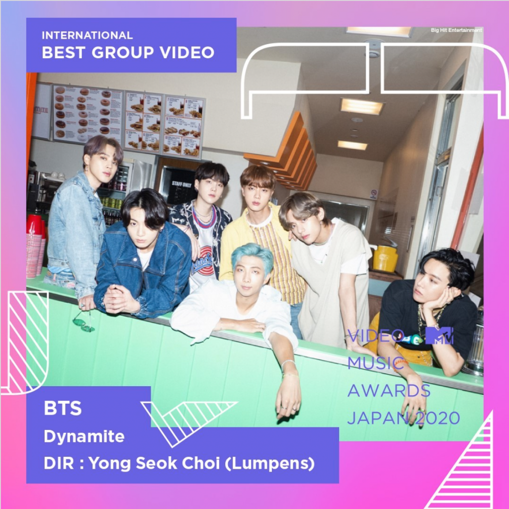 Los 2020 MTV Video Music Awards Japan anunciaron sus ganadores el 30 de octubre, dejando a “Dynamite” como el Mejor Vídeo de Grupo entre los MVs internacionales.