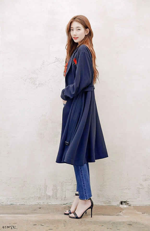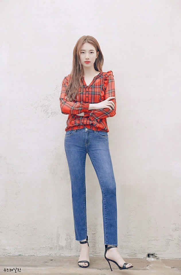 La ropa que se encuentra llevando Suzy pertenece a la nueva colección de esta temporada en Corea del Sur. Los pantalones de bota ancha, las blusas sueltas y las mangas largas son la tendencia que ha adoptado “Guess” hasta finales de año.