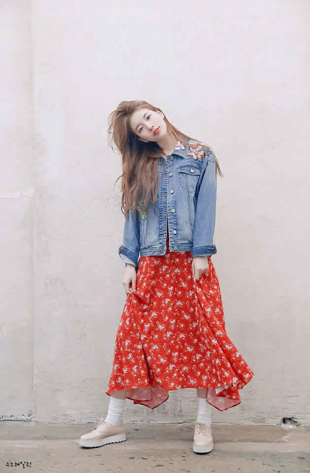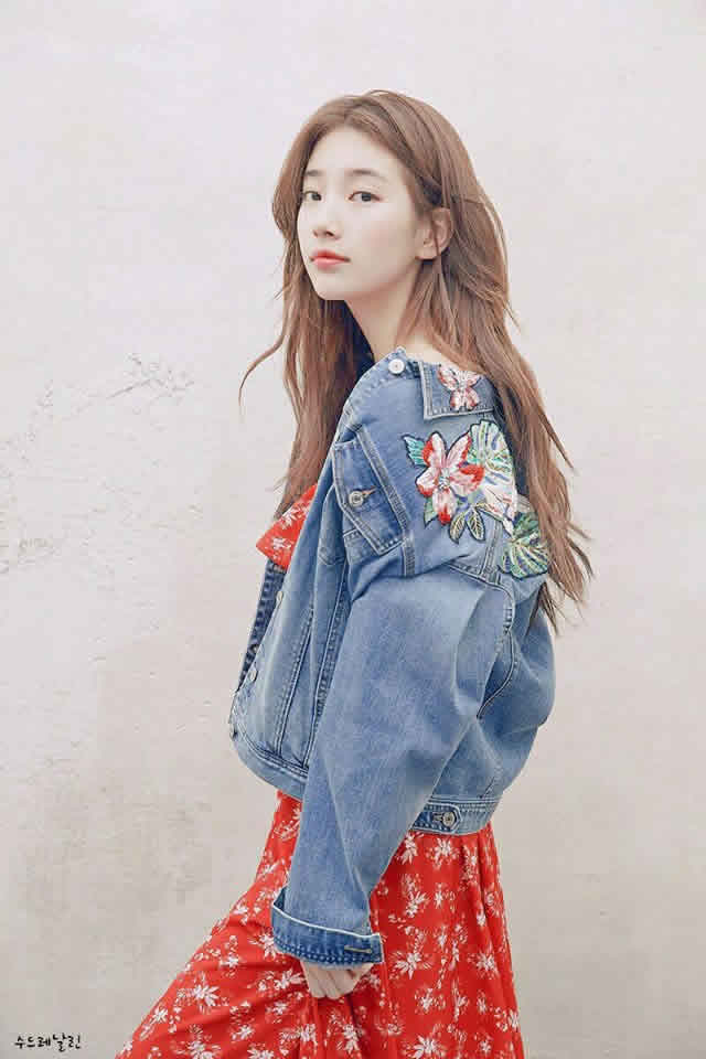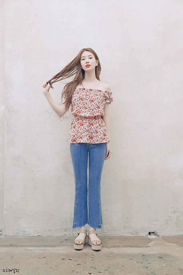 La ropa que se encuentra llevando Suzy pertenece a la nueva colección de esta temporada en Corea del Sur. Los pantalones de bota ancha, las blusas sueltas y las mangas largas son la tendencia que ha adoptado “Guess” hasta finales de año.