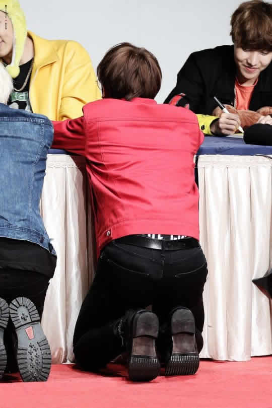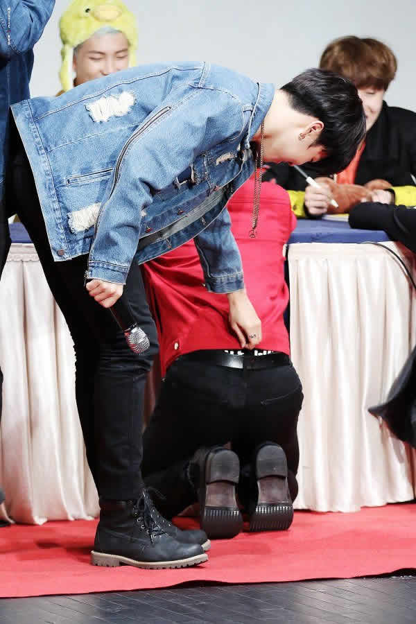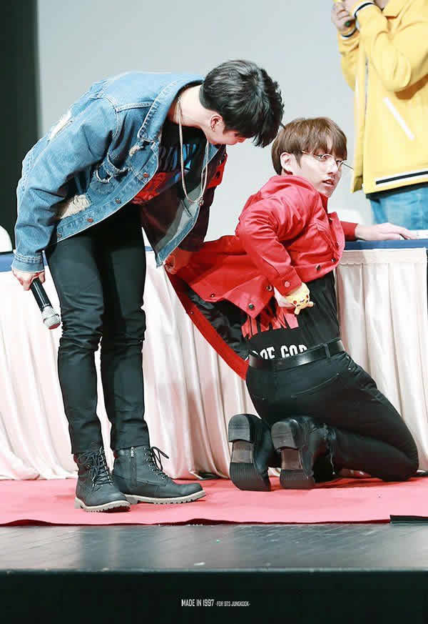En un evento de fans, el conocido maknae de oro quiso jugar un poco y decidió agacharse para aparentar ser un fans, pero algo se notaba debajo de su chaqueta. Todos pensaban que era su ropa interior, es por ello que Jimin se acercó para taparlo.