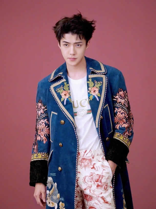 El pelo desordenado pero con estilo de Sehun y la mirada audaz lo hacen seductor y seductor mientras que empareja el abrigo azul largo con una camisa blanca de Gucci debajo y continúa el flujo de patrones florales con los pantalones vivos del vestido floral rosado y blanco.